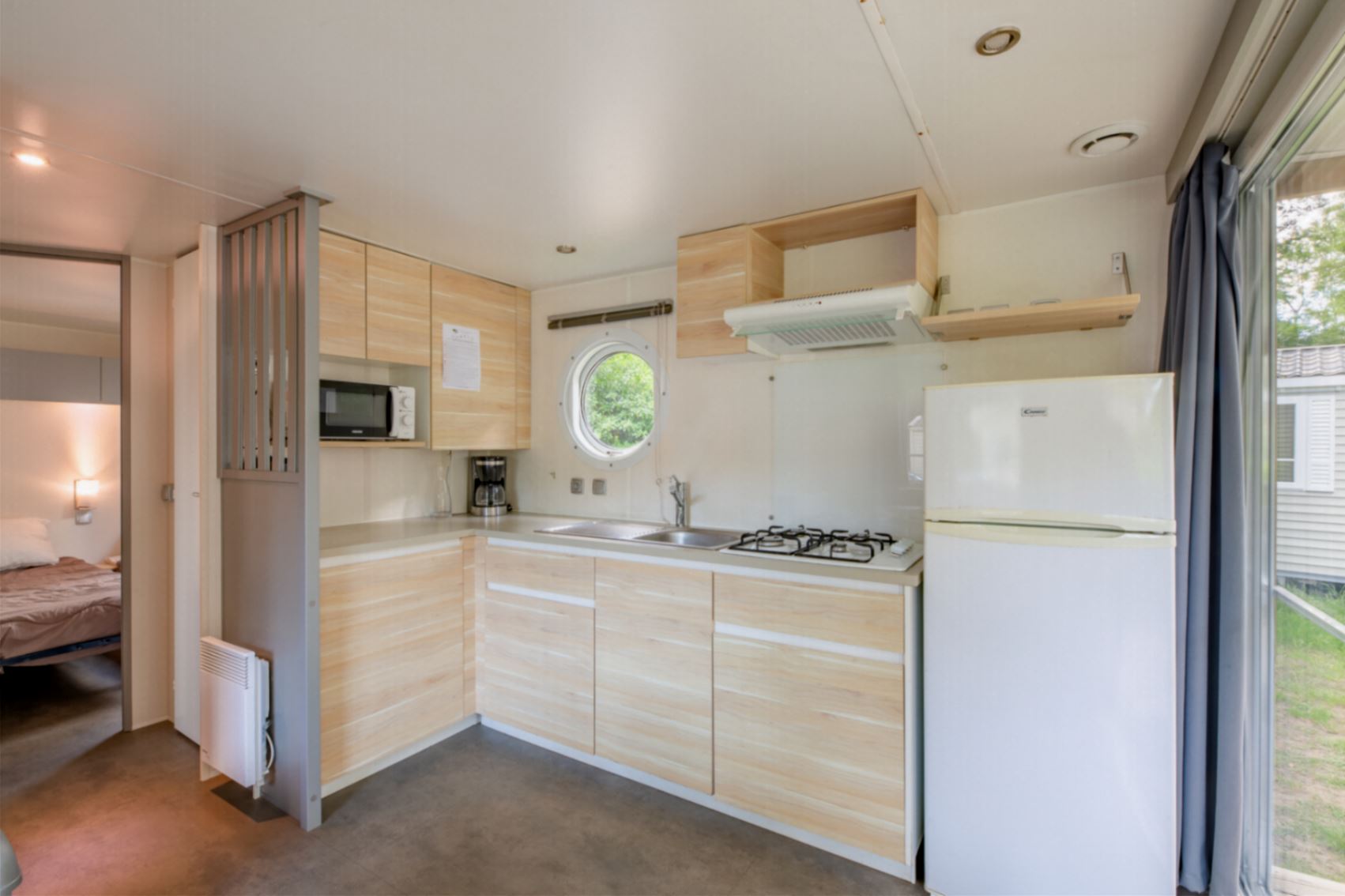 Mobil home de 32 m² climatisé, pouvant accueillir jusqu'à 4 personnes. Composé de 2 chambres, d'un séjour/coin cuisine équipé, d'une salle d'eau et de toilettes séparées. Terrasse balcon partiellement couverte.