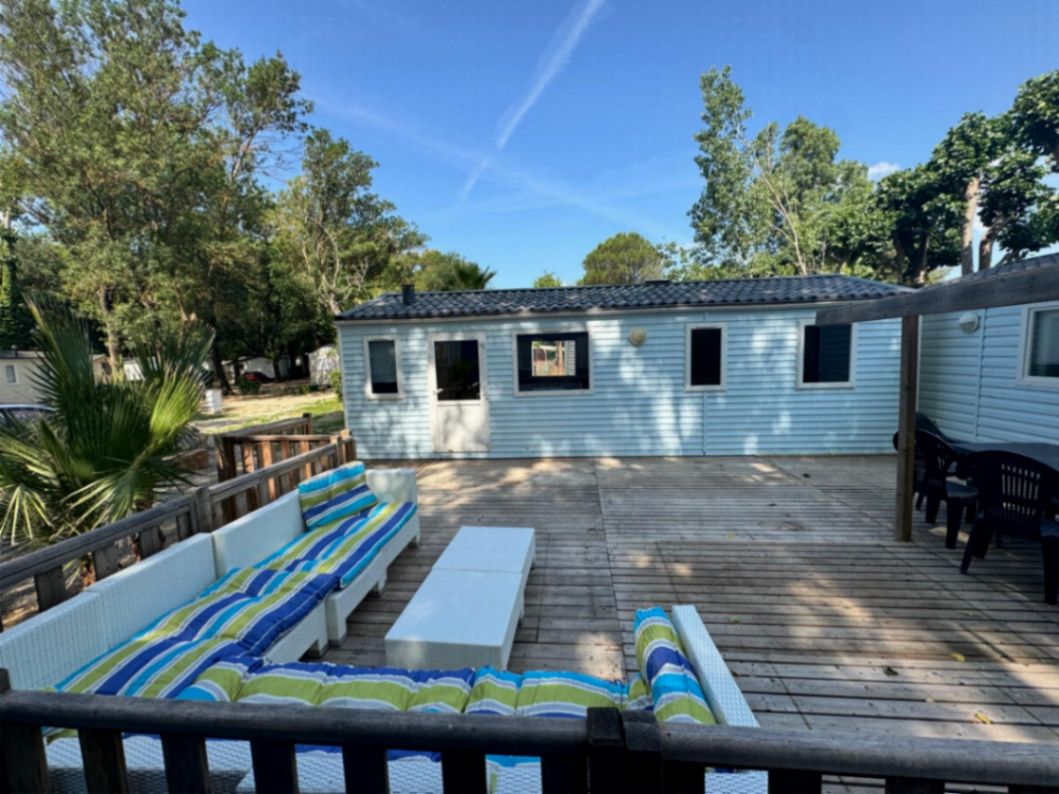 Mobil home climatisé de 32 m², pouvant accueillir jusqu'à 6 personnes, composé de 3 chambres, un séjour avec coin cuisine, salle d'eau et toilettes séparées. Terrasse balcon de 15m².